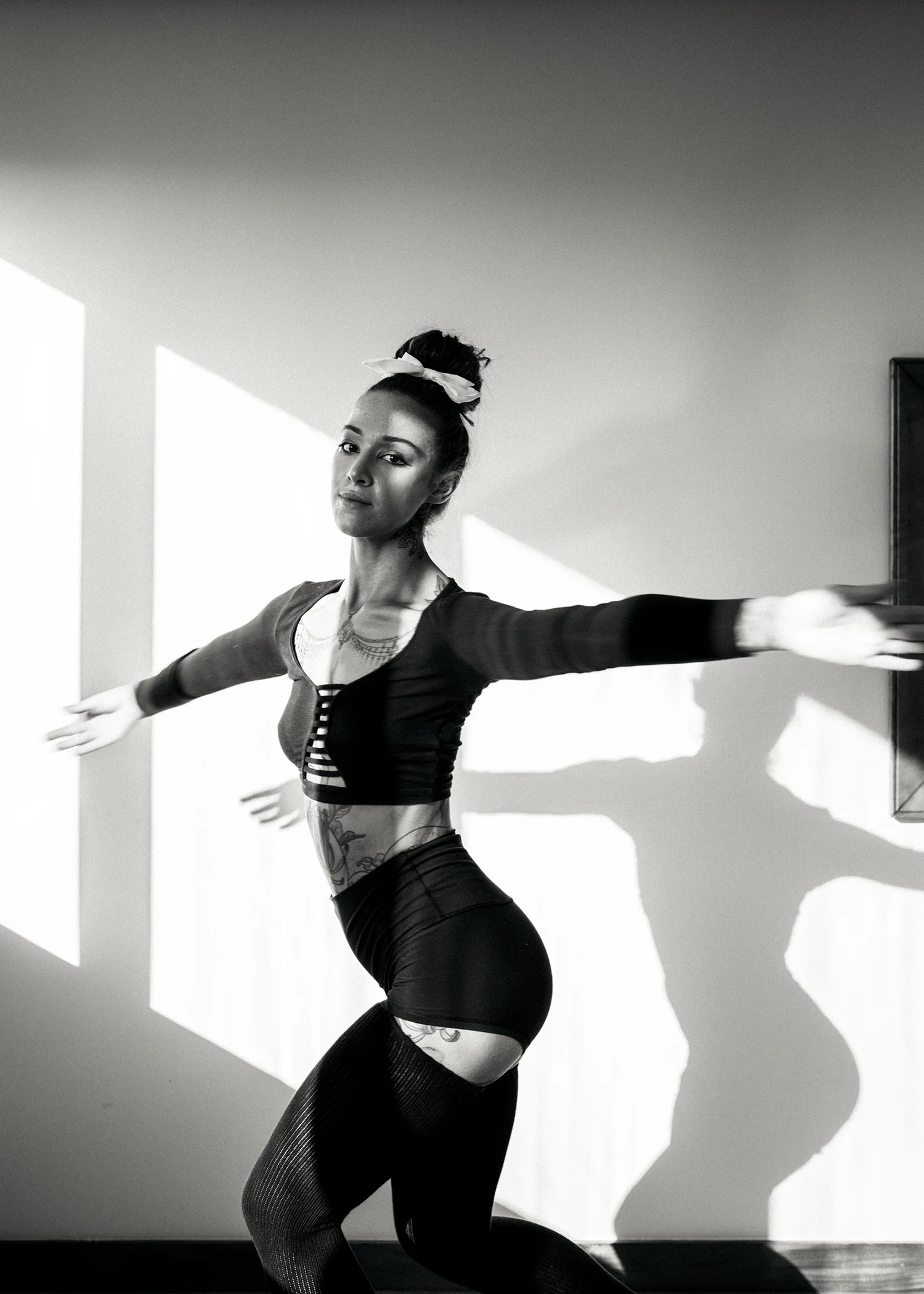 I kept my shutter speed low – about 1/100-1/250 so that I could emphasize her movements in the photos. I exposed for the highlights so the hard light coming through the windows would hit her like a spotlight. And the light was hard. Everything was perfect. The sun was directly outside of the windows – it was as if I had a flashgun outside of the window because there were no clouds to soften the rays.